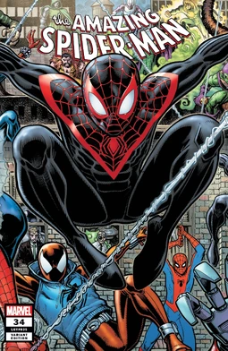 Apoyado en un coche para apoyarse, Spider-Man 2099 comprueba que lo ha encontrado justo a tiempo: sus manos empiezan a distorsionarse como la estática. Mientras Spider-Man intenta hablar con el Doctor Doom, Spider-Man 2099 le aparta del camino mientras el Doombot desata un torrente de llamas verdes. Mientras Spider-Man 2099 intenta explicar su presencia, el Escuadrón Berserker de Roxxon llega y los ataca. Agarrando a Spider-Man, Spider-Man 2099 conjura una barrera de energía y dice que ha vuelto al pasado para poder encontrar a Spider-Man. Spider-Man comenta que Miguel había dicho que si volvía al pasado de nuevo la línea temporal se colapsaría, dándose cuenta con horror de que el colapso ya está ocurriendo. Miguel le explica que empezó lentamente, con sólo pequeños cambios, pero que fue empeorando hasta que se desató el caos. Los científicos de 2099 determinaron que el origen era una anomalía originada en el Universo Marvel Prime -sacando a relucir que es como siempre-. Miguel afirma que ese descubrimiento provocó otra revelación impactante: a diferencia de todas las demás líneas temporales futuras alternativas que se han ramificado desde el Universo Marvel Prime para convertirse en otras Tierras fijas dentro del Multiverso, la Tierra de Miguel y la Tierra de Peter son una misma sin ramificaciones. Mientras Spider-Man plantea la teoría alternativa de que sus universos están superpuestos, Miguel afirma que no hay nada que pueda hacerse para evitar el colapso porque su universo natal es el futuro del de Peter y el futuro siempre está cambiando. Mientras el cuerpo de Miguel se distorsiona, Spiderman pregunta qué está pasando, Miguel dice que hay muchas cosas que quiere explicar, pero que no hay tiempo. El campo de energía explota, dejando fuera de combate a los supersoldados de Roxxon y destruyendo el Doombot. Spiderman mira a su alrededor, se da cuenta de que Miguel ha desaparecido y se pregunta qué le ha pasado. Preocupado por si Miguel ha muerto, Spider-Man observa que lo que haya pasado no puede ser bueno y que aún no ha terminado.
