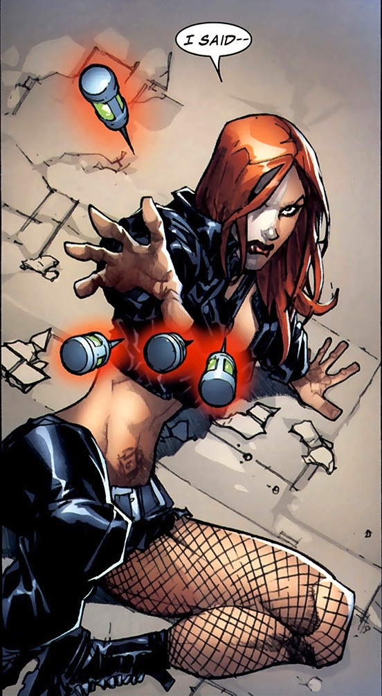 Telekinsis: Ella puede hacer levitar objetos y personas y también puede proyectar un campo protector o fuerza telekinético. También puede liberar ráfagas de fuerza devastadora. Con este poder, ella puede volar a gran velocidad. Ella puede hacer levitar objetos pequeños a distancias cortas (como las armas de menos de 10 libras, cuchillos, navajas, etc.), que su personaje de "Bloody Mary" a menudo recopila y ensambla en improvisadas armaduras de batalla.