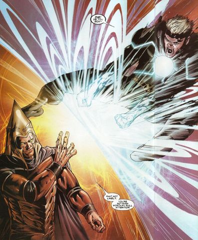 - Génération de plasma : Il peut émettre des rafles de plasma à partir de l'énergie absorbée, généralement en tant que cercle concentrique. Ces vagues émanent de son corps dans toutes les directions sauf s'il les canalise dans une seule direction, bien souvent là où il pointe les bras. La force déployée est extrêmement destructrice. Quand le rayon frappe un objet avec ce plasma chaud, la différence intense de température fait que la cible explose, se brise ou se désintègre. Au minimum et avec un contrôle parfait, le rayon donne un gros mal de tâte à un humain, mais sans le brûler.