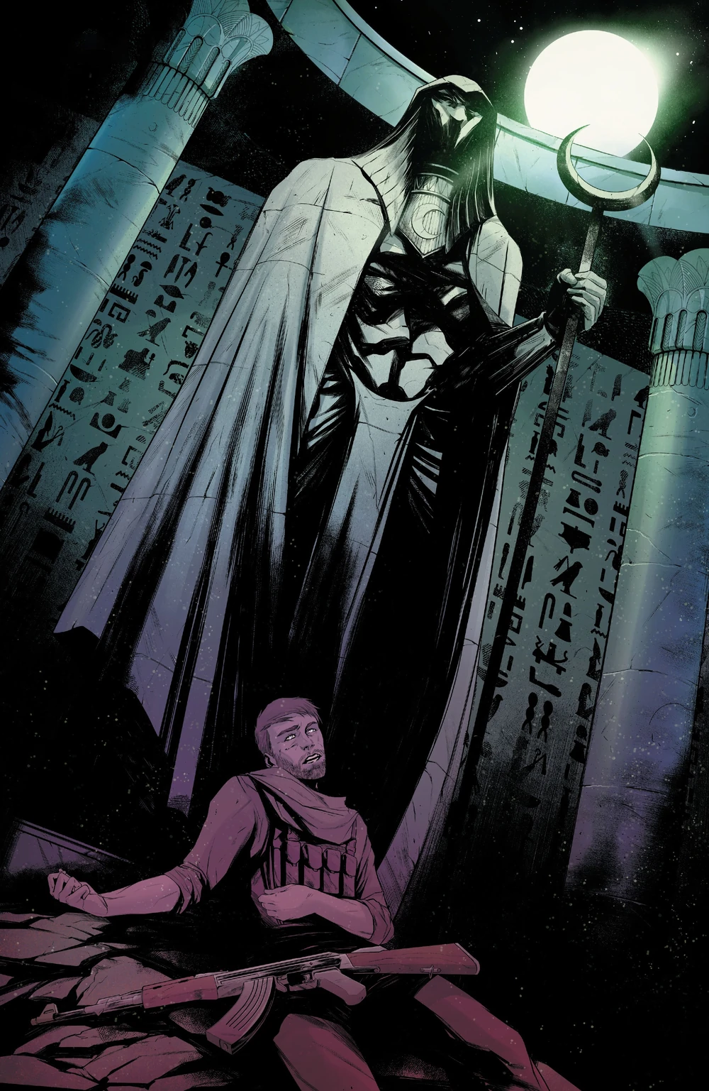Il vendit l'idole de Khonshu à une galerie d'art Parisienne. Plus tard, il reprit sa cape blanche pour combattre le crime, au grand dam de Marlene, incapable de gérer ses changements de personnalités chaotiques, et elle le quitta. Spector voyagea dans la Vallée des Rois, en Égypte, où il rencontra trois prêtres de Khonshu. Ces derniers lui donnèrent de nouvelles armes, lui annonçant que Khonshu l'avait choisi pour être son nouveau champion. Il réalisa alors que le dieu modifiait ses personnalités.[28]