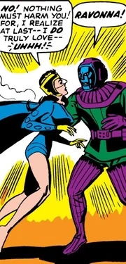Dans son 40ème siècle natal, le véritable Kang était tombé amoureux de la Princesse Ravonna Renslayer, une princesse d'un royaume Terrien. A cause de son amour pour elle, il permit à son père de rester à la tête de son royaume mais poussa Ravonna à l'épouser, pour assurer la continuité du règne. Ravonna refusa et Kang voulut prouver sa toute-puissance en téléportant Oeil-de-Faucon, Vif-Argent et la Sorcière Rouge dans son futur pour les battre dans un duel. Captain America réussit à retrouver Kang et le défia à son tour dans e futur, où Kang l'emporta. Mais Ravonna refusa toujours de l'épouser, tandis que les Vengeurs se préparaient à défendre son royaume.[22][19][11] L'armée de Kang se révéla invincible et captura les héros. Mais Kang voulut épargner Ravonna et son père, ses lieutenants virent cela comme une preuve de faiblesse. L'un d'eux, Baltag, prit le contrôle de l'armée, et Kang dut demander l'aide des Vengeurs pour sauver Ravonna qu'il aimait vraiment. Ravonna fut finalement séduite par Kang. Quand Baltag se libéra et tira par surprise sur Kang, Ravonna tenta de s'interposer et elle fut mortellement touchée.[23][19][11] Baltag fut exécuté. Kang utilisa sa technologie pour conserver Ravonna en état d'animation suspendue, ni morte, ni vivante.[24][11][19] Cet évènement se déroula aussi dans les lignes temporelles de nombreux autres Kang...