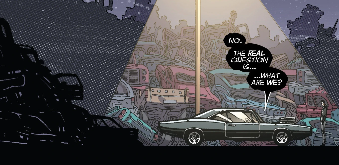 Gdy zapada wieczór Robbie jedzie do swojego miejsca pracy by popracować przy aucie. Wtedy przychodzą gangsterzy by odzyskać narkotyk ukryty w samochodzie. Widząc chłopaka mierzą do niego z broni. Na szczęście chłopak przemienia się w Ghost Ridera co sprawia, że z łatwością ich pokonuje, a następnie jedzie na wysypisko gdzie powraca do postaci człowieka i zastanawia się przez co się to dzieje. Ni stąd, ni zowąd z jego samochodu zaczyna dobiegać głos, który oznajmia ''Prawdziwe pytanie brzmi... Kim my jesteśmy?''