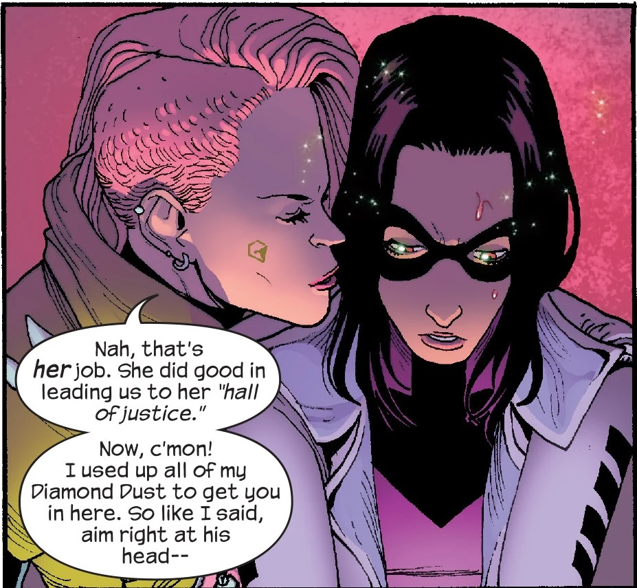 - Ее произвище связано с тем, что она использует в качестве орудие алмазы.