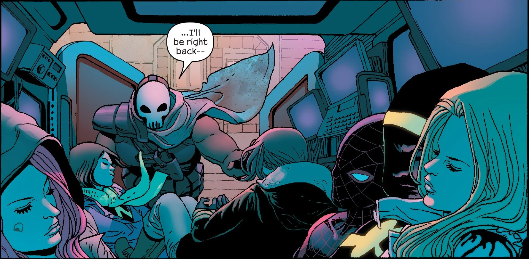 Вскоре Энтони похищает всех участников Алтимейтс, за исключением Ланы, и прячет их в фургоне вместе с Рейчел, однако ее помощник успел угнать фургон наемника, чтобы спасти напарницу. В этот момент Рейчел, придя в себя, освобождает связанного Майлза, надеясь, что он ее первой развяжет, но тот не доверяя ей, развязал лишь своих товарищей. Неожиданно, товарищ Рейчел был случайно ранен Таскмастером, и Плащ переносит всех, чтобы избежать аварии.