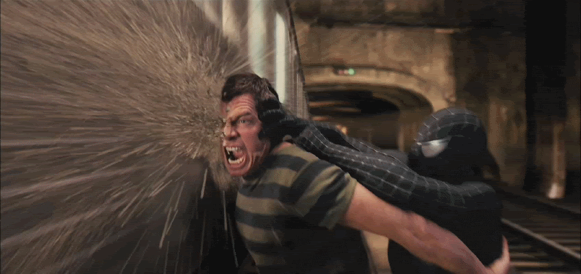 Человек-Паук рассекает голову Песочного Человека поездом.