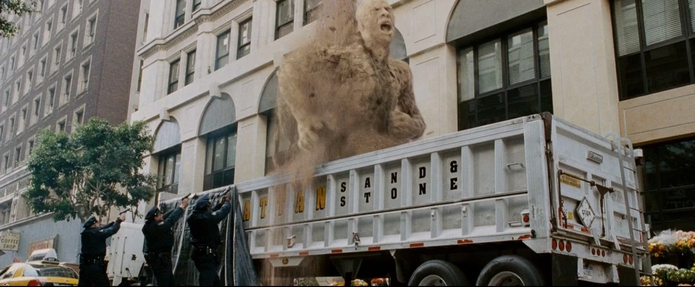 Неподалёку полицейские замечают как ни в чём не бывало шагающего по улице Флинта Марко. Они начинают преследовать беглеца, но тот прячется в кузове грузовика, наполненного песком. Один из стражей порядка забирается в кузов и замахивается на песок лопатой, как вдруг его отбрасывает в сторону. Частицы песка собираются в гигантскую фигуру человека. Полицейские стреляют в преступника, но Песочный Человек легко справляется с ними одним ударом огромного кулака и отступает, пустив частицы своего тела по направлению ветра.