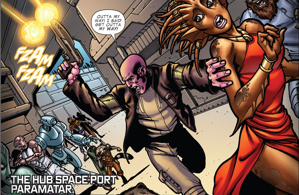 Получив деньги, Грут вместе со своим напарником прогуливается по планете. Девушка, встретившаяся по дороге, предлагает им зайти в бар и выпить. Внутри к Ракете обращается мужчина и указывает на объявление и награду за его голову. Неизвестный, как и множество инопланетян, хватается за оружие. Енот достаёт лазерную пушку и начинает отстреливаться.