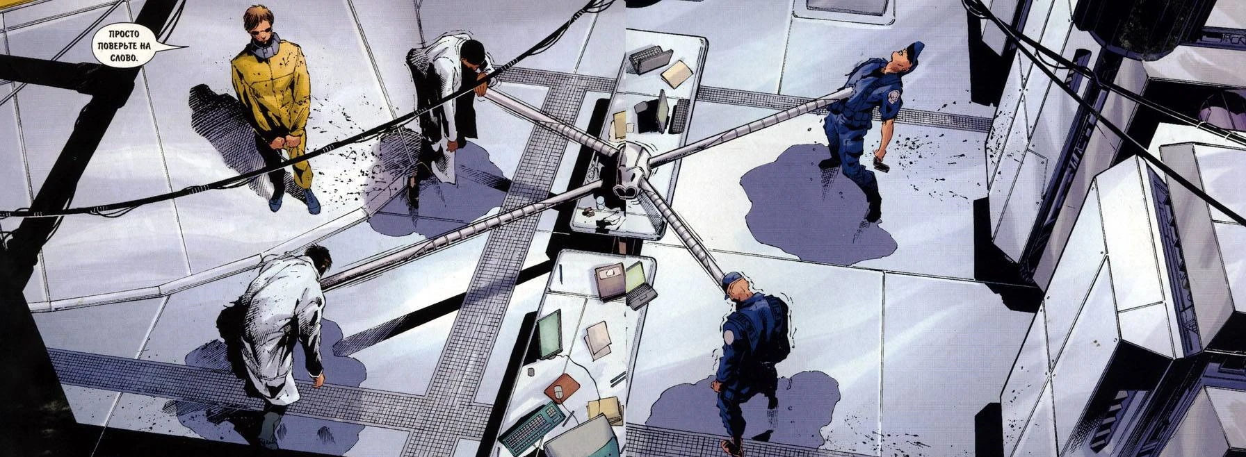 - Генри Пим проводит психологическую беседу с заключёнными в Трискелионе Норманом Озборном, Отто Октавиусом, Максом Диллоном, Флинтом Марко и Сергеем Кравиновым.