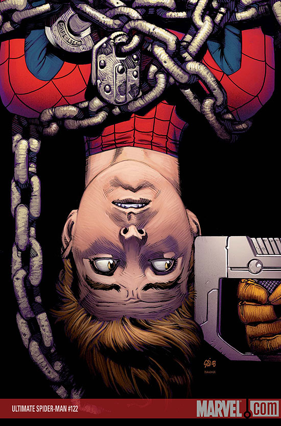 Питер Паркер в костюме Человека-Паука без маски привязан цепью к потолку вверх ногами в тёмном помещении. Подходит Шокер с маской героя в руке и начинает наносить ему удар за ударом своими виброперчатками.
