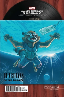 - Mike Hawthorne's Rock-N-Roll variant originally featured Groot hanging from Rocket's belt. According to himself, he decided to remove it later on because it muddied the composition of the cover.[1]