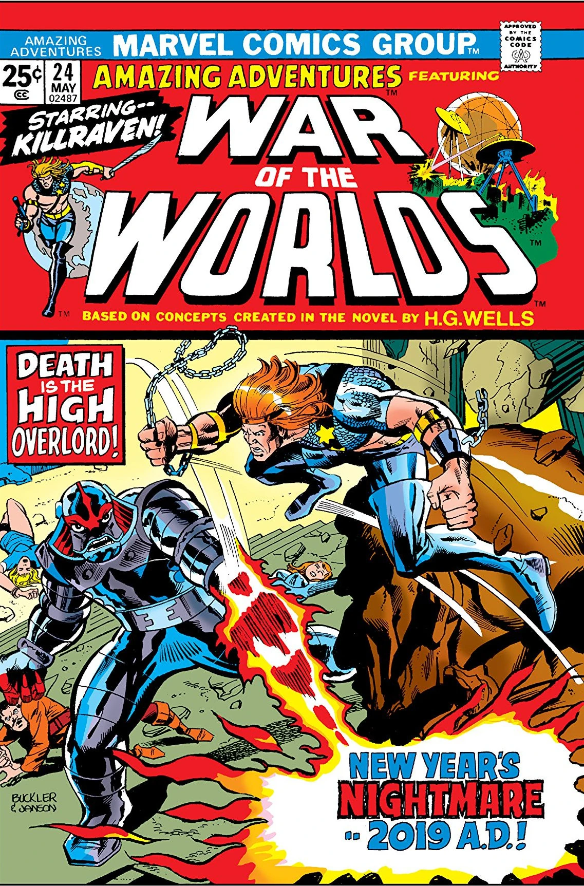 At the Lincoln Memorial, the High Overlord tells Killraven that his escape from the rats (last issue) has only inflamed the rebel cause. The High Overlord promises to carry out Killraven's death sentence. Suddenly, though, Rattack and his rats appear. Abraxas seizes Rattack. The High Overlord tries to shoot Killraven with a beam from his gauntlet, but he hits a slave instead. Killraven fights with the other slaves and turns his back on the High Overlord, who prepares to blast him. Sabre fires at the High Overlord, but the beam bounces off his chest and hits a column. "You don't think we'd give you anything that could hurt us?" sneers the High Overlord. The column, though, falls, followed by the roof above it, and the next column, and the roof above that one...