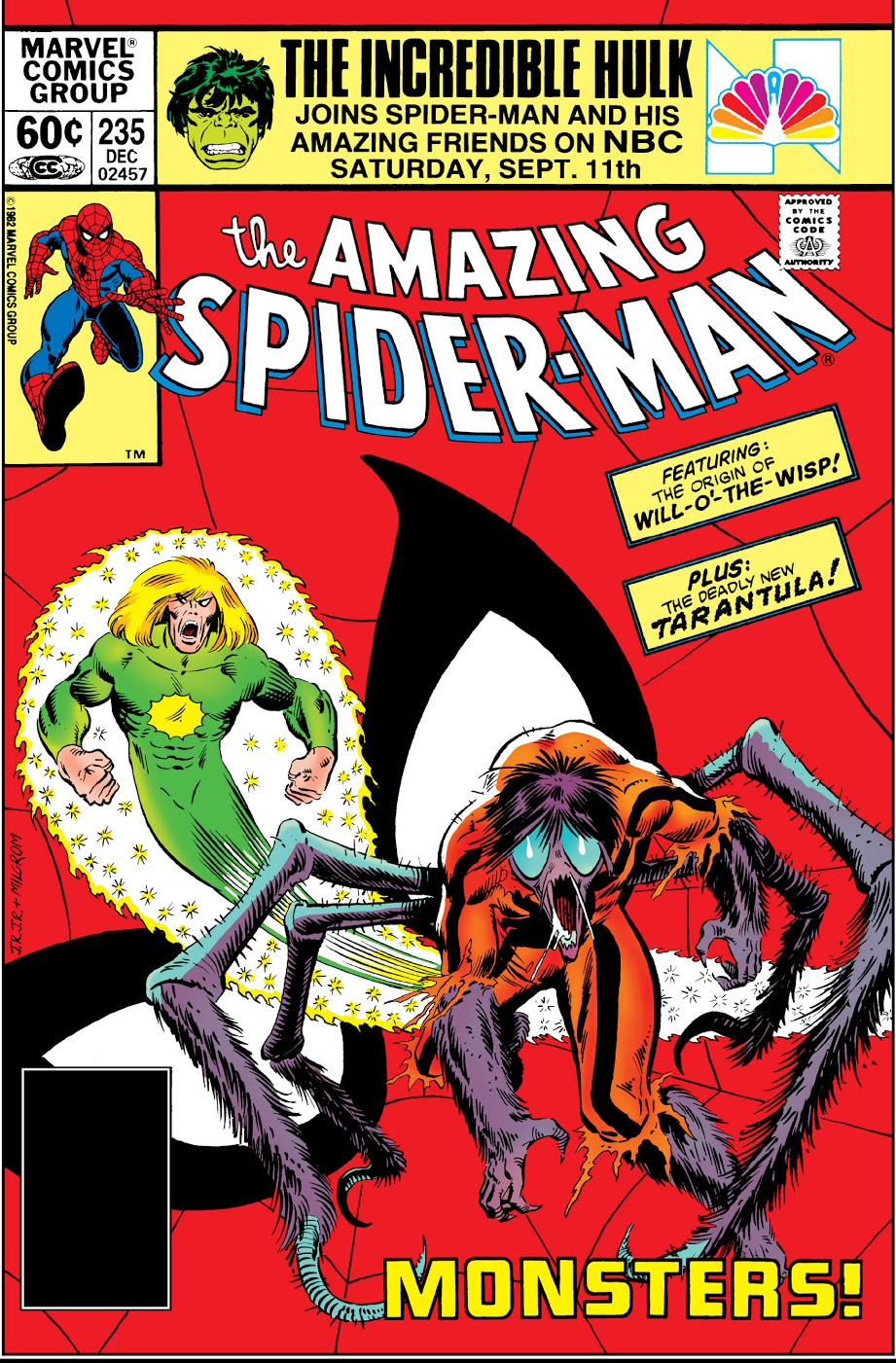 Will O' the Wisp electrifies himself by grabbing a nearby lamp and asks Melvin to shake his hand as thanks for all he has done. That's when Spider-Man intervenes and tries to convince the Wisp that if he kills Melvin, he would be no better than the Brand Corporation. This angers the Wisp who engages Spider-Man in battle. The wall-crawler tries his best to stop Wisp, but his abilities make it difficult to subdue him. Before either man can win their battle, they stop when they hear the shriek of the Tarantula, who now has Melvin as his prisoner.