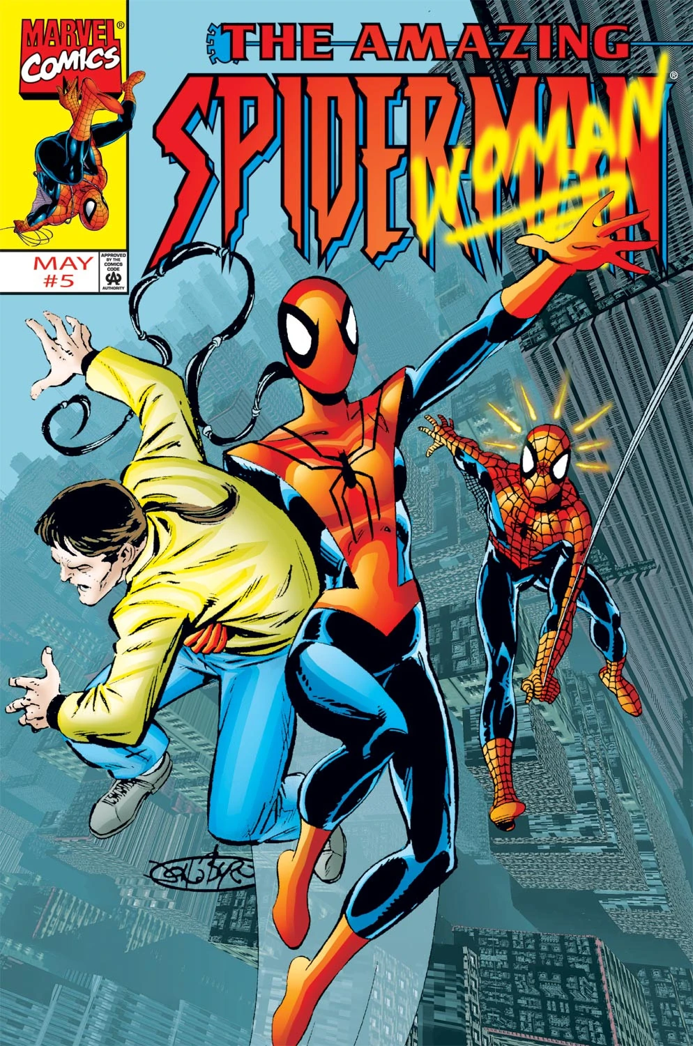 Back in New York Mary Jane is ready to go on a fashion shoot when she almost finds out Peter is hiding his Spider-Man costume in her carry on bag. Julia Carpenter has fallen victim to the new mysterious Spider-Woman two days earlier. At the Daily Bugle, Jameson is hassling an intern to get the paper out on the streets with the headline "Who is the New Spider-Woman?" when Peter figures it out to be only Mattie Franklin who had impersonated him recently. Spider-Man and Mattie meet up just in time to be attacked by the new Spider-Woman who wants to aborb both their powers.