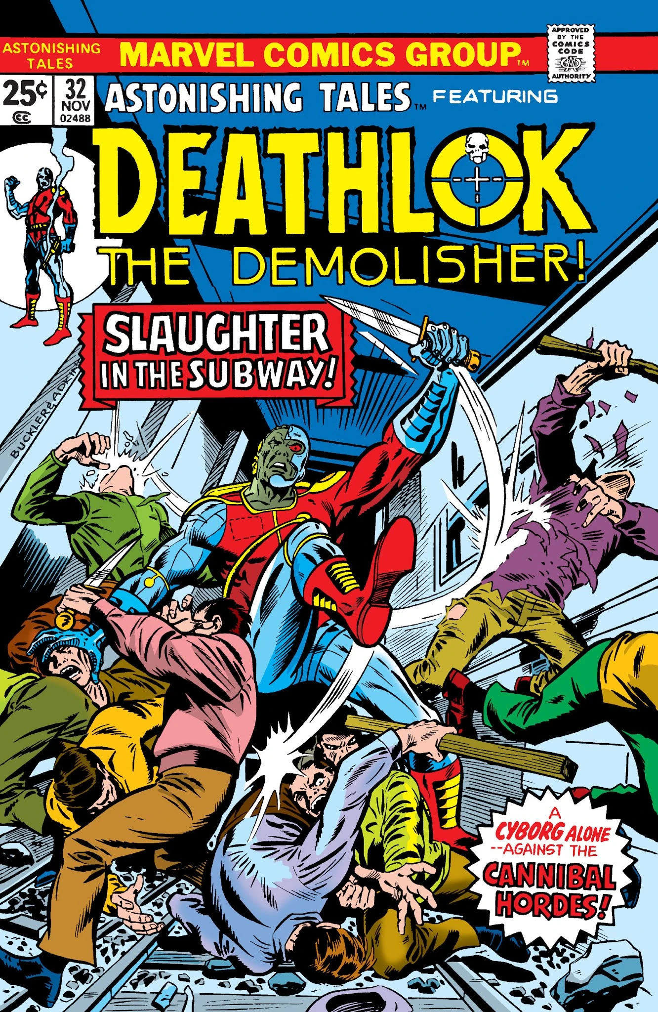 Deathlok throws his dagger at the tail rotor of the escaping helicopter to send it into a spin, giving him a chance to catch up to where it lands, but by the time he does the informant inside has already fled. He tracks his target to an abandoned subway where it seems like he's being attacked by cannibal gangs, but the computer determines that they're mind-controlled drones instead. Deathlok fails to save the informant's life, driving him into a berserk rage against the drone army. He makes it away with only the informant's payment to show for it, which turns out to be counterfeit anyway.