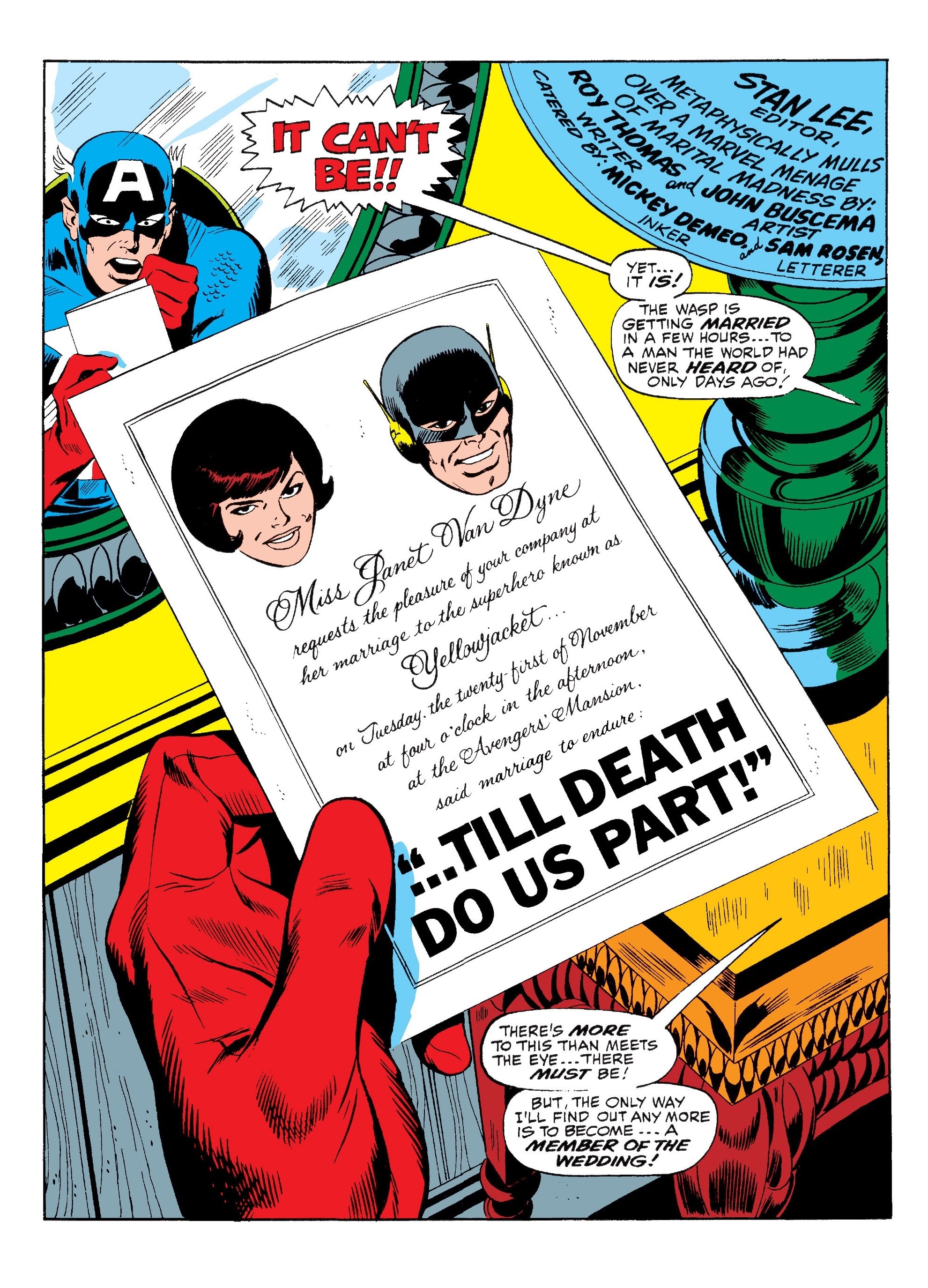 Captain America is shocked to receive an invitation to the wedding of the Wasp and Yellowjacket. When he arrives at Avengers Mansion and asks the other Avengers what happened they tell him of their encounter with Yellowjacket and how he supposedly killed Goliath. Just then Jan and Yellowjacket arrive, and Hawkeye almost starts a fight with the mysterious new-comer but is stopped by Captain America.
