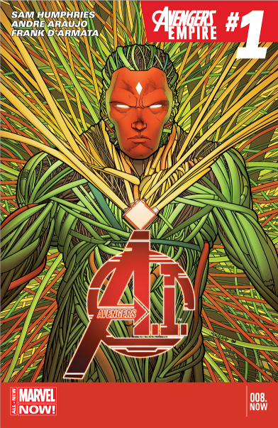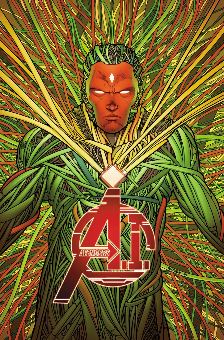 The war between organic and artificial intelligence destroys the world of tomorrow, starting in AVENGERS A.I. 8.NOW! Dimitrios, the vengeance-seeking scion of Hank Pym and Ultron, downloads death and destruction across the planet in his quest to eradicate civilization. The Vision and his robot Avengers team up with the UNCANNY AVENGERS to rescue humankind from the precipice of extinction!
