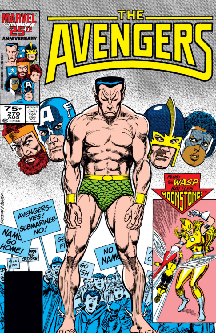 The demonstrations over the Sub-Mariner's admittance into the Avengers reaches a boiling point. The Avengers return from Limbo and start some immediate crowd control. They quickly discover that Moonstone has spurred on the crowd, however, she's unable to stand up to the Avengers and is defeated. She's taken by the police, who turn out to be the Absorbing Man and Titania in disguise. Calm is restored until Namor learns that he is being sued by an insurance company for past damages.
