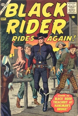 - This series intended to soft reboot the Black Rider character, making use a domino mask. The series was cut short by the Atlas Implosion of 1957, but material for issue #2 and more were used in the next years as inventory stories by Atlas in different series. One of them only was published in Austalia in The Fast Gun Vol 1 9.