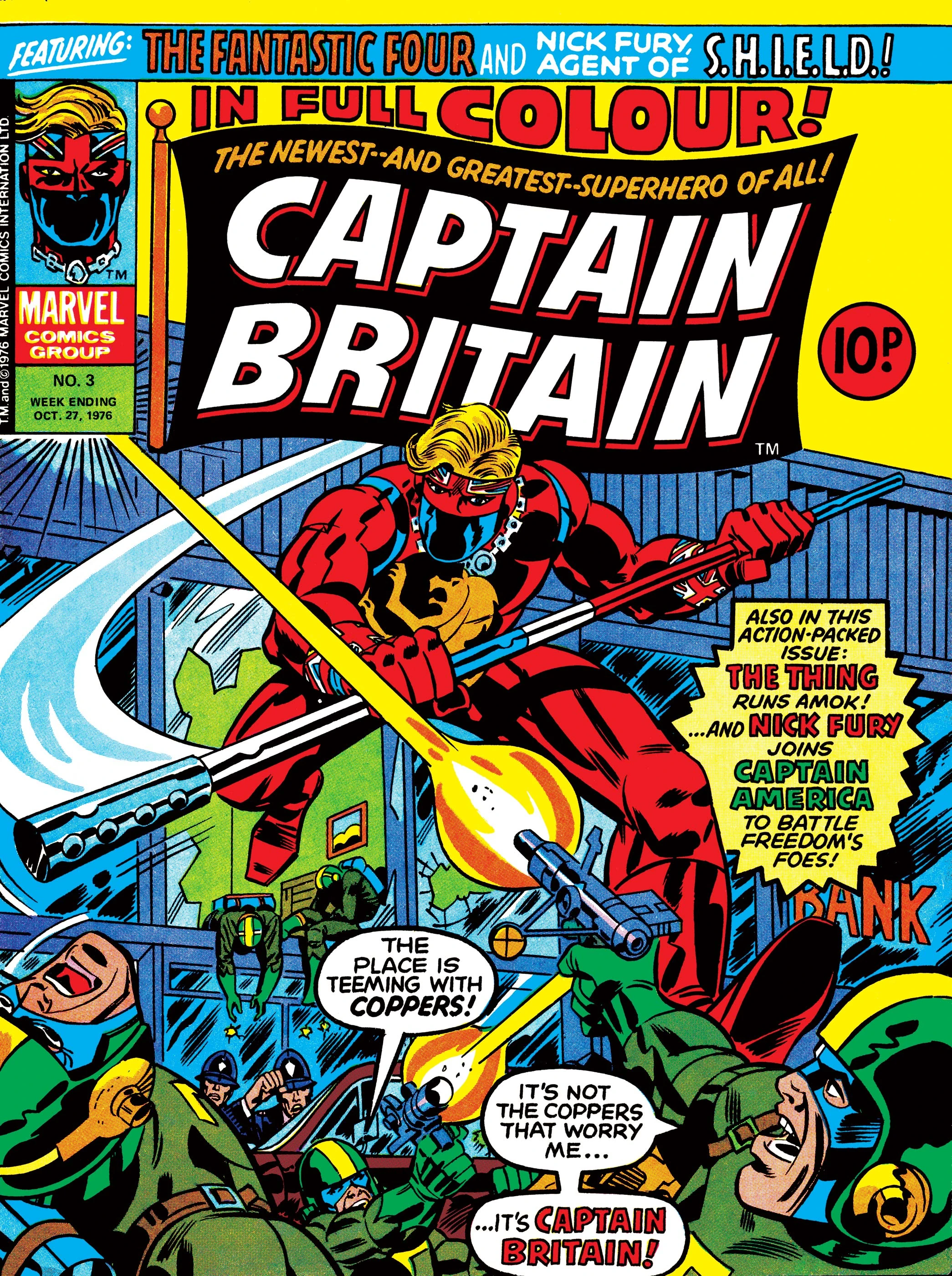 Captain Britain stops a bank robbery, but Detective Chief Inspector Dai Thomas is in no mood to be grateful to him. And, we meet Brian Braddock's classmates at Thames University! But waiting in the wings is a new threat: Hurricane...