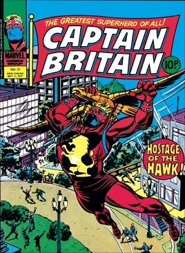 Captain Britain tackles Lord Hawk and appears to be winning, until a jealous Jacko Tanner attacks him while he's distracted, angered by Courtney Ross's attraction to the hero. The Captain, caught off guard, is grabbed by the robot hawk...