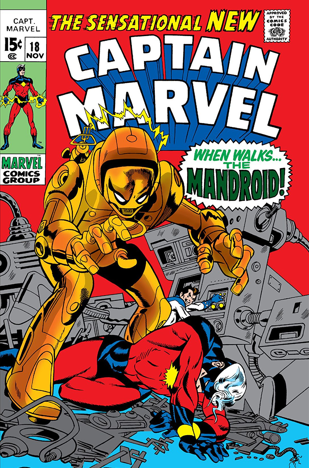 Yon-Rogg has taken Carol to another abandoned Kree outpost on Earth, where there is a Psyche-Magnatron, a device that has long since been banned by the Kree empire. Yon-Rogg uses the device to create a Mandroid robot. When Mar-Vell arrives to save Carol, he has to face both the Mandroid and Yon-Rogg. During the battle Carol is injured and the Psyche-Magnatron damaged. Mar-Vell destroys the Mandroid and manages to escape as the Psyche-Magnatron explodes, killing Yon-Rogg in the process, but Mar-Vell manages to get far enough away that he is only mildly stunned by the blast. With the battle over, Mar-Vell changes places with Rick, who is just as physically exhausted as Mar-Vell and collapses on the ground.