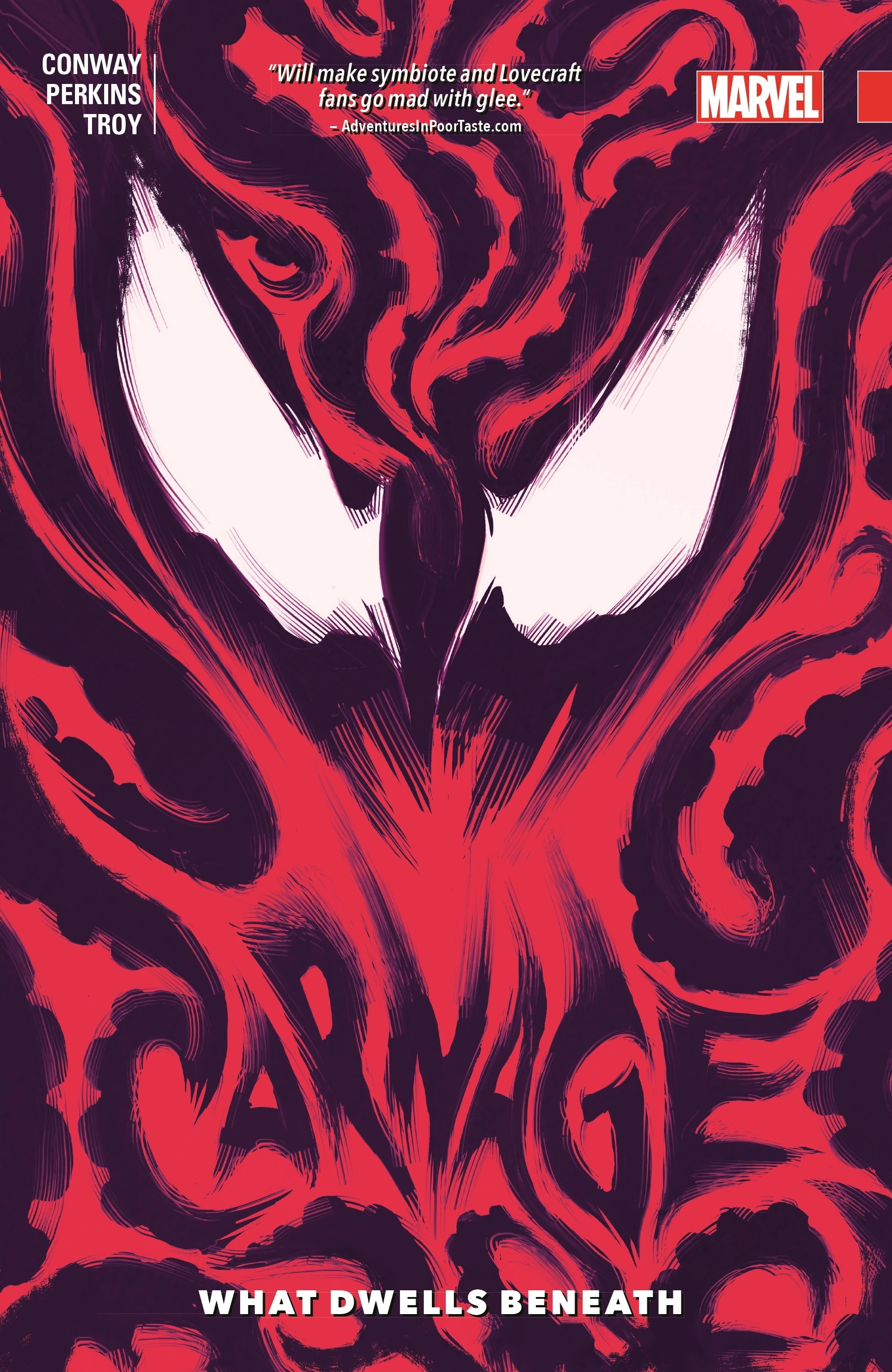 Carnage's search for more power leads him to an enigmatic and secluded island. But who are the island's mysterious inhabitants - and what terrifying secrets do they hold? The members of the Anti-Carnage Task Force who've made it this far prepare to follow Carnage into this death trap - but drastic measures will be called for if they're to survive any longer. Can they bring themselves to work together with their most hated enemy? Or will this be a one-way trip to Carnage Island? For months, Cletus Kasady believed the Darkhold held a great prophecy for him, but now he'll learn the full, terrifying truth! The symbiotic serial killer is about to come face-to-face with true darkness! As a godly power rises, will anyone make it out alive?