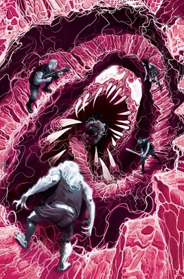 In the fuel hold, Yuvraj finishes planting the bombs and announces they have five minutes to escape, turning to where Man-Wolf is tearing apart the symbiote-hybrids. As Man-Wolf turns, snarls, and advances towards him, Yuvraj calmly tells him to remember who he truly is: Colonel John Jameson of the American Air Force. Reverting to human form, John remarks that Yuvraj must love taking risks, but Yuvraj states he's simply a man of faith. In the engine room, Victoria states their time is up, but Manuela protests they haven't gotten the book. Victoria shouts that their bullets might hurt Carnage but can't kill him, and that sinking the ship will take both Carnage and the Darkhold to the bottom of the ocean. As they turn to run, Manuela calls out to Toxin that the ship is about to explode and urges him to run. Pinned by Raze, Toxin grumps that's easy for her to say, then punches Raze away. When he reunites with the others, Manuela asks where Claire is, only for Toxin to retort that his former handler is off the team. Manuela protests leaving her behind, but Toxin replies that he has a feeling she'll be right behind him.