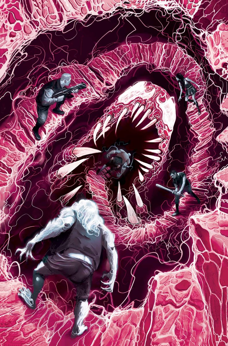 Outside the engine room, Manuela looks over several dead symbiote-hybrids and remarks that Claire may be cold as ice but she's tough, asking Eddie how many bodies there are. Eddie counts eight, ten including the ones blown to pieces. Victoria senses the presence of the Darkhold on the other side of the hatch and presses the activator. Eddie transforms into Toxin and rips through the door, revealing Carnage, Brother Gregori, and the Darkhold. Carnage quips that it took them long enough, and Toxin mockingly remarks that he's been busy. Carnage states that he's just as surprised as they are at the effect the Darkhold's had on him, stating that wonders never cease, but that the wonders he's seen are just the beginning. Victoria demands that Carnage relinquish the Darkhold, and Manuela asks where Claire is. Carnage remarks that their FBI friend is in the room with them, but that she isn't called "Claire Dixon" anymore. A dark grey and black feminine symbiote detaches from the ceiling and introduces herself as Raze. As Manuela reacts in horror, Victoria tells her to leave Raze to Toxin and then opens fire on Carnage, who is surprised that the bullets hurt him through the symbiote. Victoria remarks that the bullets are adorned with Chthonic symbols and Manuela quips that he may be immune to sonics but not magic as they both open fire.
