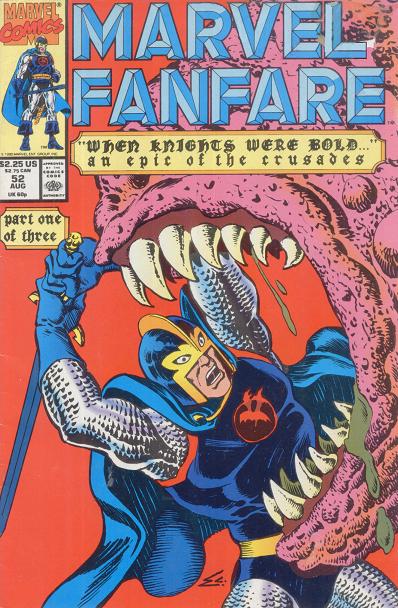 Dane later fought alongside the Defenders against the Enchantress, but was apparently turned to stone by her. The Valkyrie took possession of the Knight's Ebony Blade and his winged horse, Aragorn, and Dr. Strange took custody of his petrified form.[9] The Defenders later attempted to restore him using the Evil Eye of Avalon. They discovered, however, that Whitman's spirit had been transported back in time to the 12th Century where it now inhabited the body of his own ancestor, Eobar Garrington. Whitman declined to return to the present day with the Defenders, and Valkyrie returned his sword to him; Whitman allowed her to keep the horse.[10] Later, however, he was equipped with a new flying horse named Valinor and transported (still in Garrington's body) to the present day by the mage Merlyn, to carry out a special mission. Sent to find the amnesiac hero Captain Britain, Whitman then traveled with him to Otherworld to battle the evil Mordred and his master, the demonic Necromon, and save Camelot (at some point during the course of this quest, both heroes were briefly abducted by the Grandmaster to participate in his 'Contest of Champions'). After this mission was concluded, Whitman was returned to the 12th Century, though he did briefly travel forward again to attend Merlyn's funeral. Back in the past, he protected the mystical island of Avalon from the demonic Fomor, until Garrington's body was eventually destroyed during a battle involving the time-traveling Avengers. Whitman's spirit returned to his original body, which became flesh and blood again.