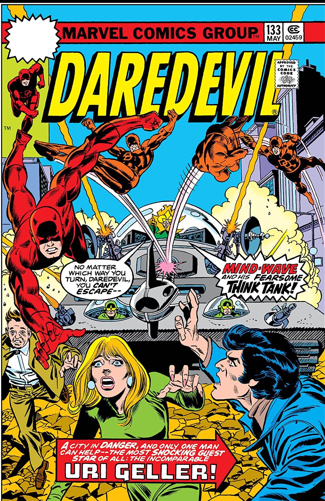 This story opens with the Jester disintegrating the individual who has helped him smear Foggy Nelson in his quest for re-election as New York City's District Attorney. These commercials have also created unrest in the city with a wave of sensational TV scenes. Meanwhile, new District Attorney Blake Tower has asked Daredevil to meet and assist the mentalist Uri Geller and help solve a crime spree in New York. Geller believes that his nemesis Mind-Wave, who he have previously confronted in Europe, is behind some criminal plot in the city. Geller's perceptions tell him Mind-Wave will strike on Wall Street. Daredevil rushes to the scene to fight Mind-Wave and his minions. Geller also arrives and assists Daredevil with his incredible mental powers that can bend and remove steel bars from their moorings. The two defeat Mind-Wave and our tale ends on an upbeat note.