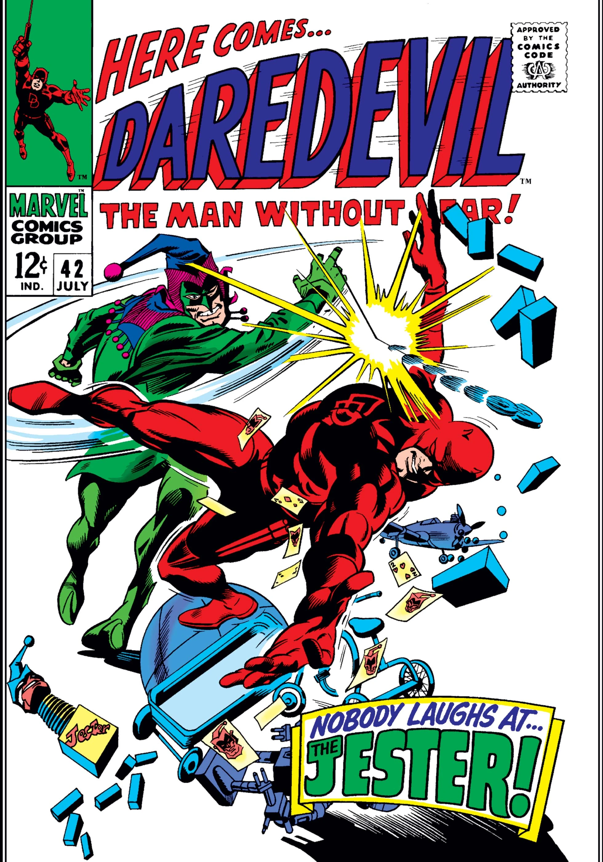 There's a new criminal in town known as the Jester, who is robbing banks with his play-time themed gimmicks. Meanwhile, at the law office of Nelson and Murdock, those present mourn the loss of Daredevil (all believing that Daredevil was Mike Murdock, the brother of Matt, who was really Matt himself posing in a third identity) Back at the Jester's lair, he boasts to himself about his achievements as a criminal. Reflecting on his past, it turns out the Jester is a failed actor, who couldn't act at all and his "big break" was being the brunt of the jokes in a comedy routine. Taking on the Jester guise and beginning a career in costumed crime is his way at getting revenge on those who laughed and mocked him. Meanwhile, crooked mayoral candidate Richard Raleigh decides that he doesn't want a D.A. that he can't control and so hires the Jester to attack Nelson so that he is eliminated from the electoral race for the District Attorney position. Attacking Foggy while he's out with Karen and Matt, Matt allows himself to get captured so that the others go for help, explaining that his "brother" Mike trained a new Daredevil. Getting away, Matt changes into DD and battles the Jester, however the crook uses his many gimmicks to put Daredevil off balance and manage to escape.