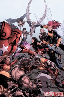 In the present, as the Quinjet approaches Utopia, Cyclops instructs the X-Men to take out certain members of Osborn's Avengers and X-Men; Archangel swoops Bullseye away from the battlefield; Colossus engaged Venom; X-23 fights Daken; Wolverine attacks Weapon Omega; Namor does battle against the Sentry; Iceman outsmarts Mimic; and the restored Valkyrie Moonstar arrives to take on Ares.