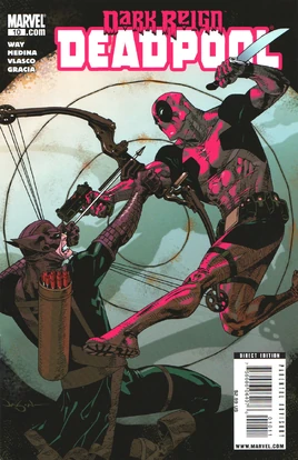 Deadpool is still after Norman Osborn for his money, so Norman sends someone with some personal history with ol' Wade - Bullseye. Deadpool is hiring himself out on Craigslist and kills a guy for giving a girl back in school a reputation that has ruined her life, and is now robbing the guy whose house he lured him to. But Bullseye kills the guy and then him and Wade go at it, with Deadpool getting an arrow through his head.