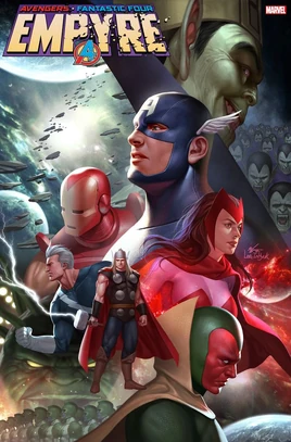 When the war fleet approaches the Moon, Mister Fantastic makes contact with Iron Man from the Alliance's command deck, where he is with the rest of his team. Reed deduces that the Alliance had been initiated by the rulers of the old Skrull and Kree regimes, Kl'rt the Super-Skrull and Tanalth the Pursuer, respectively, and they sought out Hulkling as a figurehead to consolidate the alliance. Hulkling attempts to explain that Super-Skrull and Tanalth warned him of the Cotati being a threat to the well-being of the galaxy, but Iron Man accuses the attack on the innocent Cotati to be nothing more than a stunt to cement the alliance. The Avengers and the Fantastic Four try to convince Hulkling that he has been used and prepare to stop the Alliance, but Hulkling decides to push forward. A battle unfolds between the Avengers and the Fantastic Four, and the Skrull and the Kree. Iron Man clamps a device to Thor's hammer, Mjolnir, which he uses as a delivery system to infect all of the Alliance's systems with a virus that neutralizes their ships. In a turn of events, the Cotati take advantage of the delay caused by the Avengers to wait for the Death Blossom to bloom. The leader of the Cotati, Quoi drops his pacifist facade and uses the Death Blossom's power-amplification energies to sprout vines everywhere on the Alliance's fleet, killing countless of Kree and Skrull soldiers. The Avengers and the Fantastic Four are left watching in horror as Quoi declares war on all animal life across the entire universe and sets out to turn the Earth into the birthplace of the Cotati's Empyre.