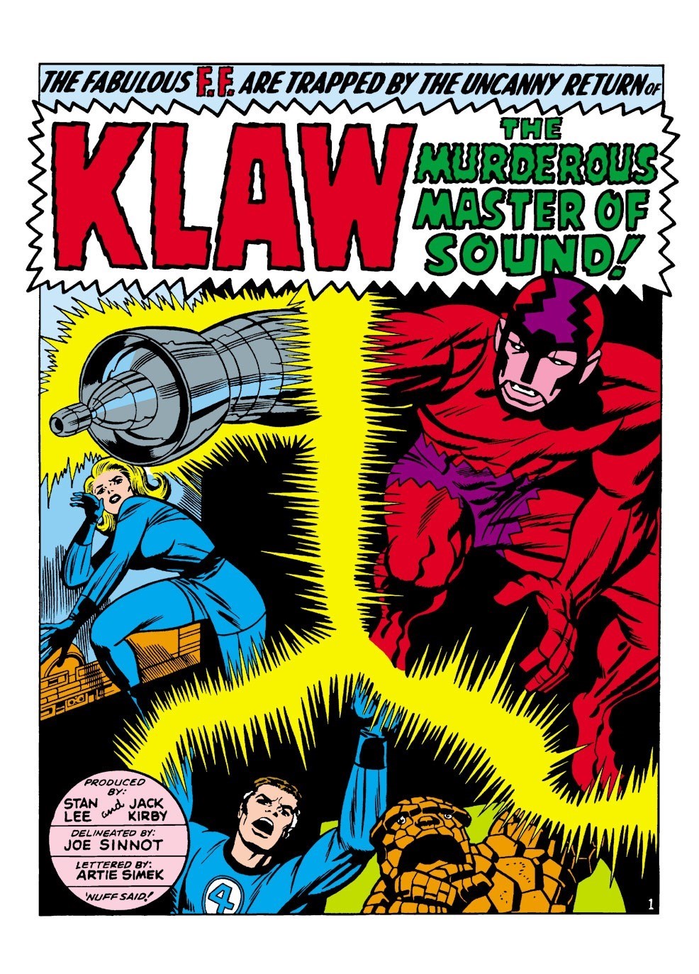 Klaw attacks the Baxter Building, seeking revenge on the Fantastic Four. The battle rages on until the Black Panther sends Mr. Fantastic a pair of Vibranium bands that he uses to beat Klaw into submission. Meanwhile, the Human Torch and Wyatt Wingfoot travel with Lockjaw, hoping that the dog will finally bring them to the Inhumans.