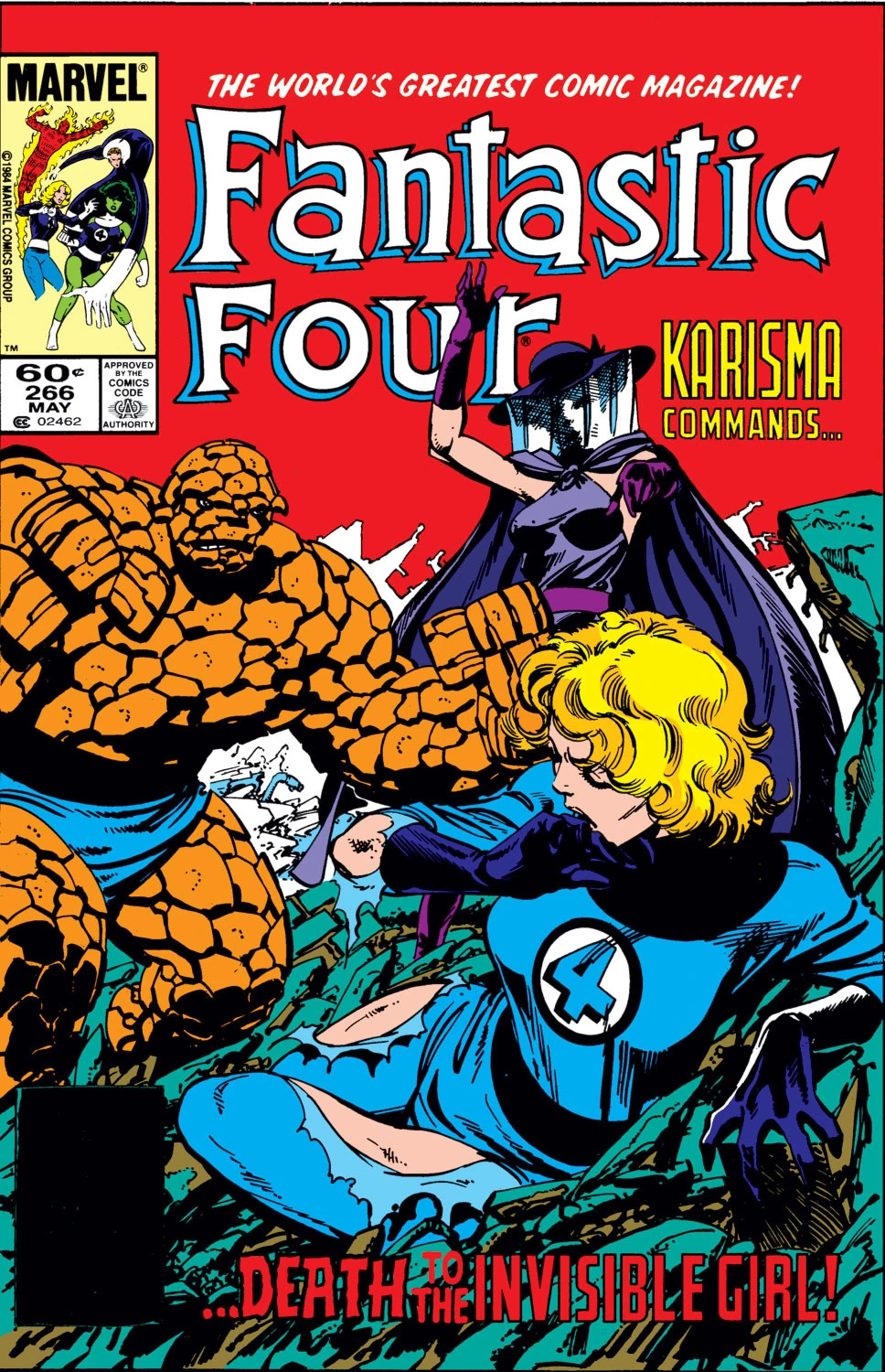 The Thing continues to attack the Invisible Girl, as Karisma watches and mocks the female member of the Fantastic Four. Wondering what sort of power she has over the Thing, Sue uses her powers to rip off Karisma's veil. She is shocked to see that Karisma's face is horribly scarred. The villain explains that the chemicals used in her mind controlling make-up have proven lethal and begun affecting her face. When she unleashes her full power on all the men around her and orders them to attack, Sue responds by using her powers to make Karima's head invisible. Unable to see her face anymore, the Thing and the rest of Karima's thralls are freed from her control. With the battle over, Sue ensures that Karisma's face is covered before turning her over to the authorities.