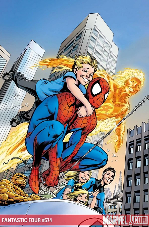 The Thing then announces the guest of honor, Spider-Man, has arrived at the party. However, as a playful prank on the kids, they have dressed up the Fantastic Four's long time mailman Willie Lumpkin as the famous wall-crawler, while the real Spider-Man playfully clings onto Ben's back. This little joke is enjoyed by the kids, but Johnny is still jealous that Franklin invited him to the party. Spider-Man then entertains Franklin by web-swinging with the boy. After the excitement dies down, Valeria announces that all the attendees are also getting gifts as well. Spider-Man gets "A Losers Guide to Women" from Johnny, while Leech gets a key that will allow him access to the Baxter Building to visit whenever he wants. Valeria also built a device for Artie that will allow him to project his thoughts for the first time since he lost his mutant powers. Eventually, the party winds down and everyone goes to bed.