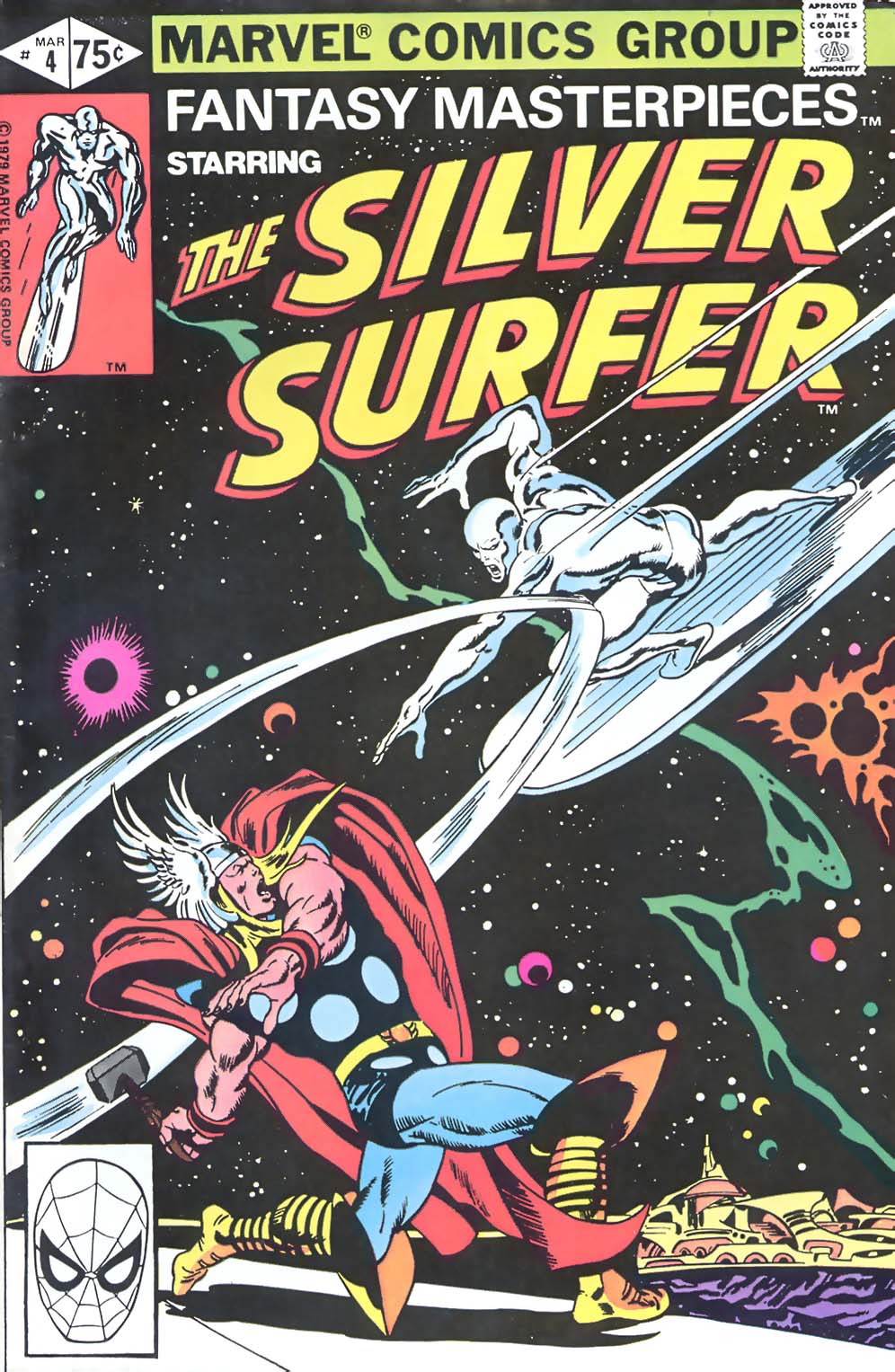 The two trade blows, but the Silver Surfer (with Loki’s power added to his own) is too much for Thor to handle. Balder and Sif rush to protect Thor and once again the Surfer is surprised by the loyalty that Thor commands. He starts to doubt Loki’s story and intentions. Before he can explain everything to Thor, Loki transports him back to Earth and back to his banishment.Notes