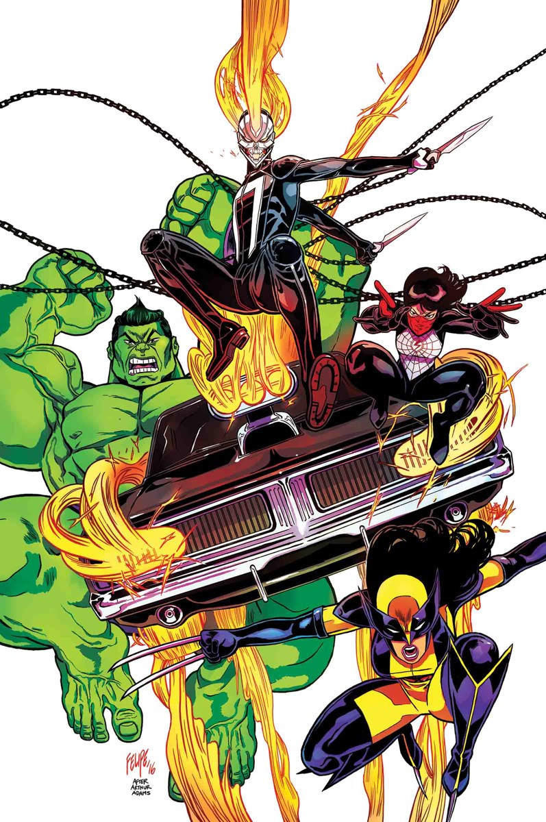 • The gang’s all here: Ghost Rider, Silk, Wolverine, Hulk and the Agents of S.H.I.E.L.D. are taking on the big space monster that stole all their powers!