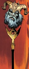 On Earth-6160, after the Maker settled on to reshape it to his image, he helped Loki ascend to the throne of Asgard, killing Odin.[8][9] Loki beheaded Odin's corpse and mounted his preserved head on Gungnir, placing it on his right side in the throne room. | Ultimates (Vol. 3) #11 |
