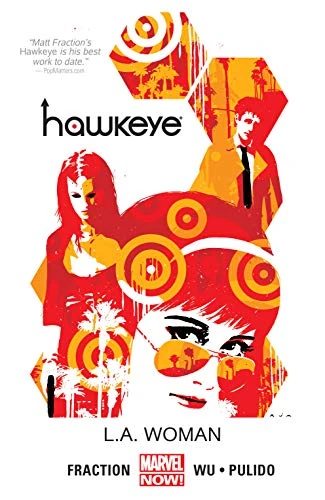 Kate Bishop heads to Los Angeles to get away from New York, life, and Clint Barton - but not away from trouble! Because Madame Masque is hanging out at poolside with the rich and famous as well! As Kate helps a reclusive and sixties-damaged pop music genius find his lost masterpiece, Madame Masque finds Kate. By which we mean starts trying to kill her again. In a broken town where cynicism and apathy has its claws around the throat of the good and decent, Lady Hawkguy is the only hero to trust!