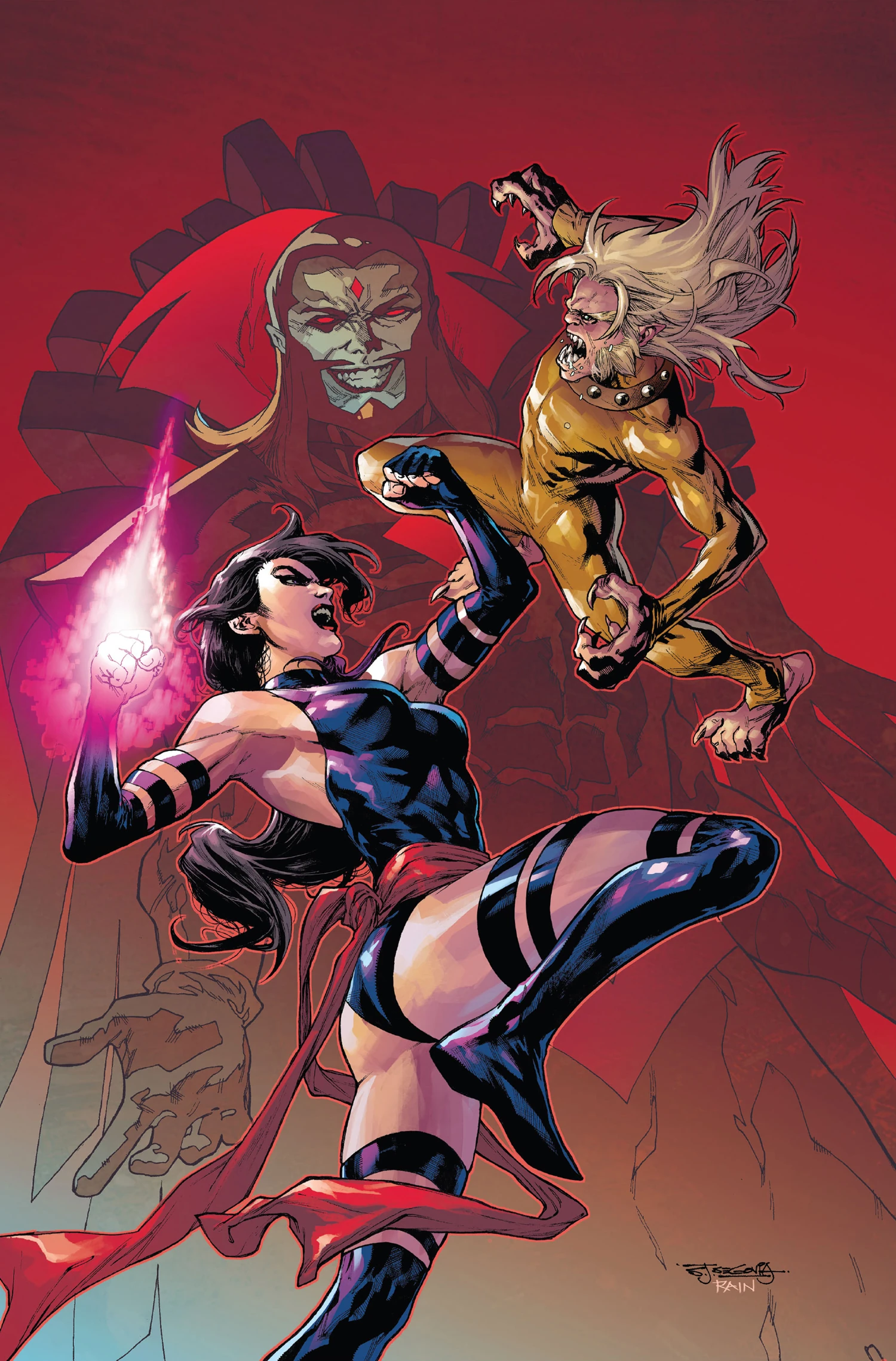 Psylocke hides and tends to wounds she received from Riptide and his throwing stars. Suddenly Wild Child emerges from the shadows, overtaken by the scent of Kwannon’s blood. Wild Child growls that Psylocke’s injuries make her unfit to be the alpha of his “pack”. He lunges at her, his claws tearing into Kwannon’s flesh.