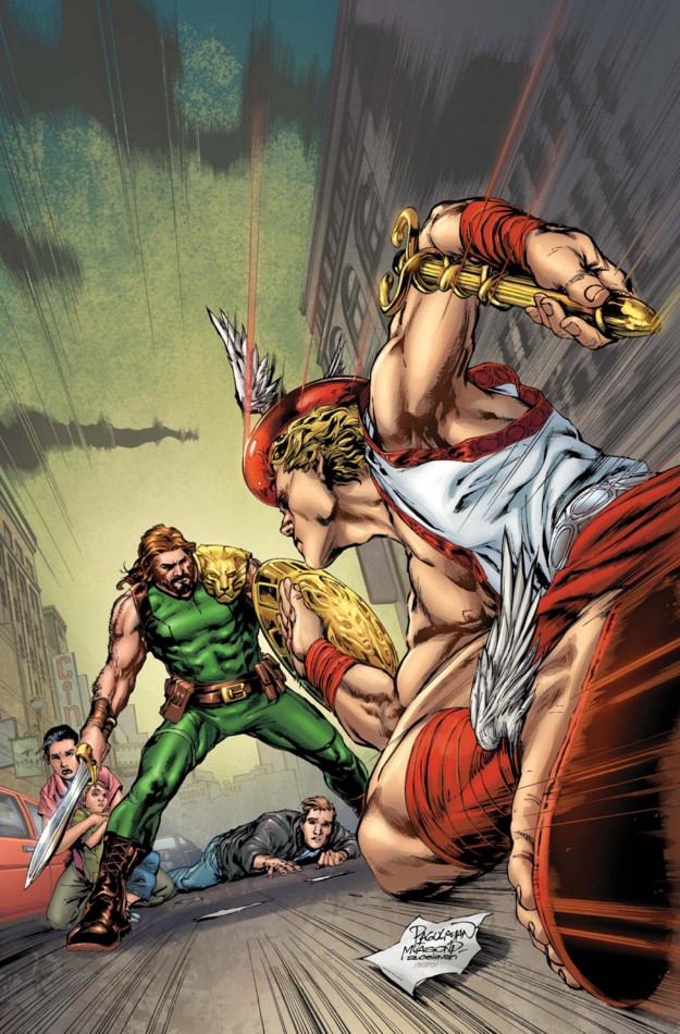 Hermes visited Ares when he was living on Earth. He took the form of a skateboarding teenager and harassed him at his job on a construction site. He stopped long enough to ask him to return to Olympus and help battle Amatsu-Mikaboshi. Ares declined as he did not want to leave his son and his mortal life.[30] Eventually Ares joined the fight to save his son, Hermes met with Inari the messenger of the Amatsu-Kami to find ways to trick people into fighting Mikaboshi. Inari came to Olympus and offered help, but Ares refused. When he asked for water, Ares gave it to him. Inari then presented the water to the Amatsu-Kami as a gift from Olympus, and they agreed to join the fight.[31] He also witnessed Alexander, son of Ares, awarded godly status by the Council of Godheads.[32]