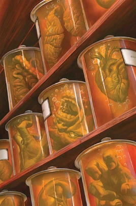 Following his fatal battle with the Avengers that left him a charred corpse,[Continuity 1] Bruce Banner is captured by the U.S. Hulk Operations and sent to Shadow Base. The base's scientists dissect his body and place his organs and body parts in separate jars, including his head. They remove his heart during the daytime but once the Sun goes down it, along with the rest of him, begins to change. With the use of an adamantium scalpel mounted on a 7 million dollar hydraulic arm, they manage to cut the heart in half. After a few minutes, both halves begin to beat.