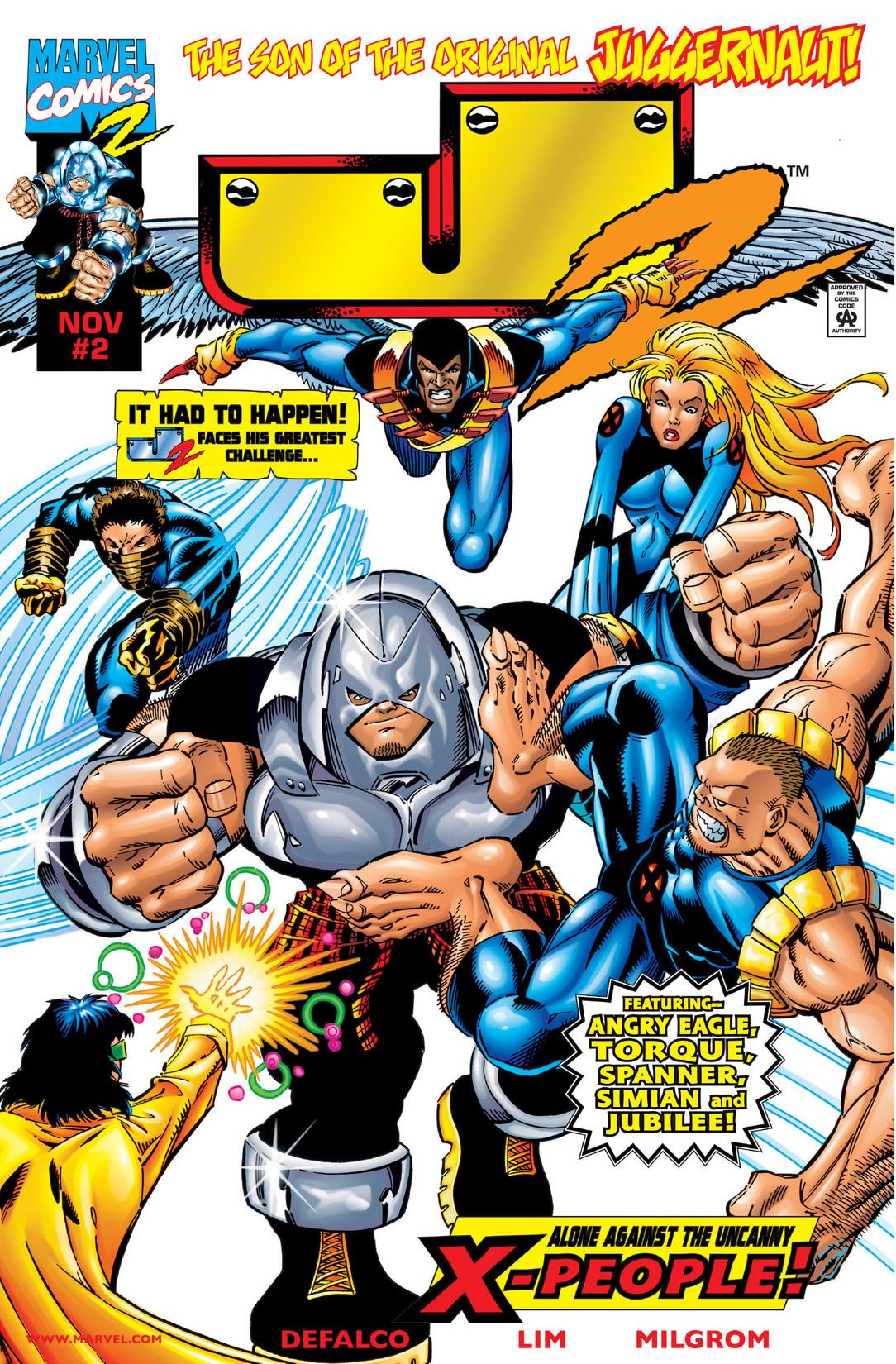 Zane is on his way to visit the X-People in Saddle River, New Jersey when he notices their gate is broken. Changing into J2, he rushes in to offer aid, but is mistaken for someone else: Enthralla, niece to the Mastermind. He is able to fight off the various X-People, but is then faced with Enthralla herself, who tries to use her powers to enthrall J2. Zane's helmet is impervious to mental and psionic attacks, though, and he is able use a shockwave to disorient her. His splash wave from the pool he used to knock out the X-People also brought them to their senses and they proceed to take care of Enthralla. The story ends with J2 being accepted as a good guy by the X-People.