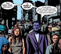 Carol tried to get Jessica to stop seeing Luke, and suggested the previous Ant-Man, Scott Lang, instead. While on a case, a strange man named Malcolm Powder came into her office claiming to be a big fan but she soon kicked him out. Soon after, a woman named Jane Jones came to her office. She said they were related as Jane is married to her cousin, Rick Jones. She claimed Rick had been missing for weeks.[21] However, Jessica had no recollection of being related to Rick and she even contacted her mother to confirm. She tracked Rick to a bar called Ultimates, and when she confronted him he asked her if she was an agent of the Kree or the Skrulls.[22]
