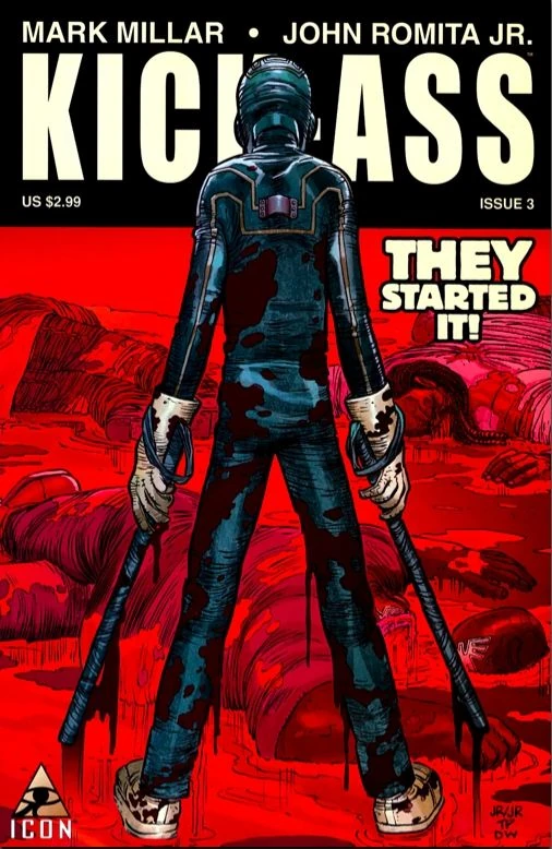 One of the messages on the Kick-Ass MySpace--set up to let people request help--was from a woman complaining about her ex making prank phone calls. He decided to go speak to the guy, Eddie Lomas, but when he arrives he finds a large man, Marv, who mocks his suit. Marv invites him into the apartment, which is full of people, who do not hesitate to mock him more. Lomas, having not seen him on the news, has no idea who Kick-Ass is and gets upset when he's asked to back off of his ex. After saying he can "call, talk to, or f*ck" her anytime he likes, Kick-Ass warns him that if he doesn't leave her alone, he'll break his legs. The people in the apartment begin to crowd around him, so he uses the pepper spray. Unfortunately he's hit in the back of the head with a champagne bottle, knocking him to the ground before he can do anything else. Kick-Ass starts to take a beating when suddenly a sword pierces Lomas' chest from behind. A small girl in purple pulls her weapon out and cleans it off. After slicing off half of Marv's head she looks at the others and asks them "what they can do".