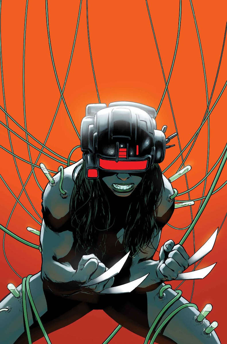 After adopting the name "Wolverine" in honor of her father,[3] Laura formed a family with her new-found sister Gabby.[27][28] Later, she was chosen to enter the Vault with Darwin and Synch,[29] where they spent hundreds of years gathering information. During this time, she developed a romantic relationship with Synch, and eventually sacrificed her freedom to let him escape.[11] After being rescued by Forge, Laura and Synch were finally reunited,[30] moving together into the X-Men's Treehouse in New York City.[31]