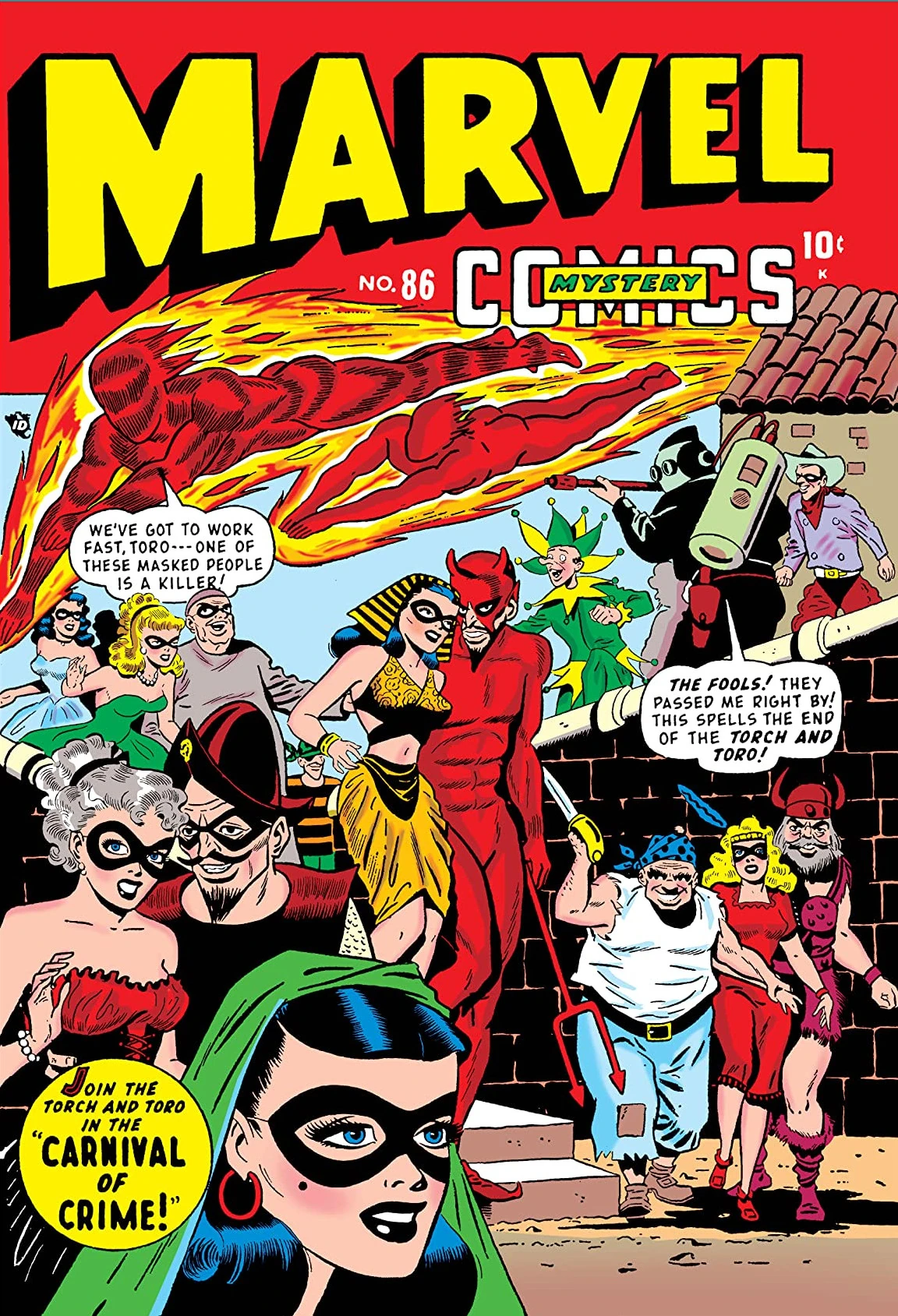 That night, the costume maker and his daughter are aroused by the sound of someone breaking into their shop. The costume maker confronts the thief, who shoots him before stealing the green mask. Hearing the shots from outside, the Human Torch and Toro flame on and fly into the shop. Although the two flaming heroes have the shooter on the ropes, he manages to escape when the mask makers daughter finds her fathers dead body. The Torch and Toro try to follow after the killer but lose him in the crowd of masked party goers. They return back to the costume shop and question the girl. She does not know who would kill her father, and when they suggest that she stay home, she tells them that Garko would be furious if some of the villagers didn't attend his party. Not liking this, the Human Torch decides to pay Garko a visit.