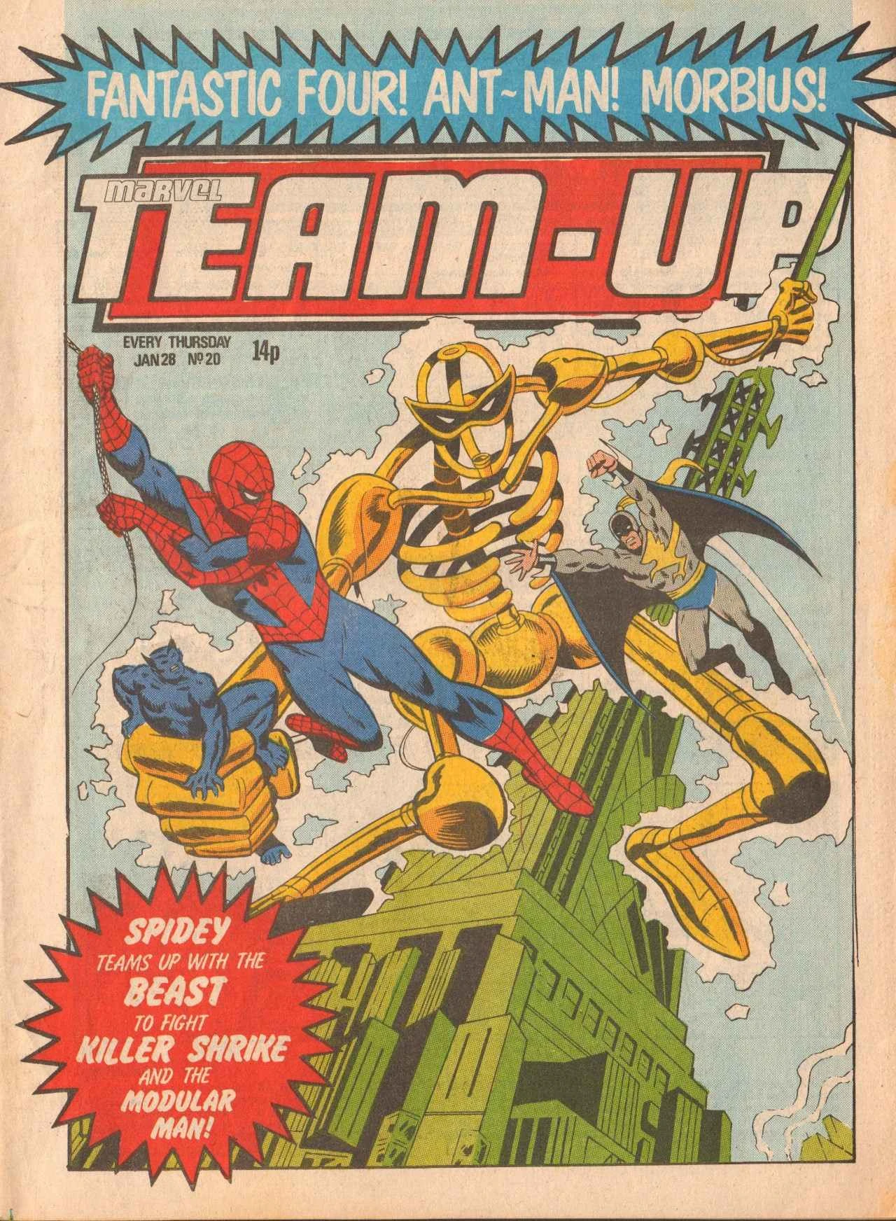 Fortunately, Spider-Man snags the unconscious criminal and hauls him to safety. The Beast says that they dare not approach the Modular Man, which would be like walking into a microwave oven. The Modular Man says that he will soon begin his reign of terror. All the human vermin that crawl on the Earth will know and fear him, he declares. Spider-Man and the Beast try to think of a way to deal with the madman, and the Beast suggests that a jolt of lightning might scramble him as it would a television transmission. Unfortunately, the sky happens to be clear.